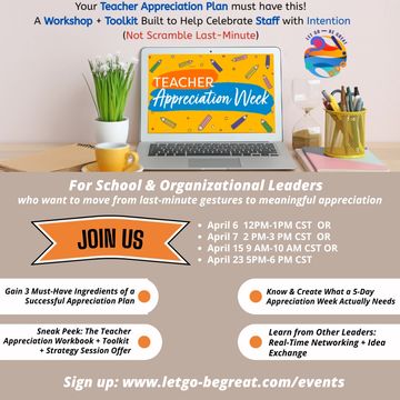 If you are a school or organizational leader who supports educators, this free Teacher Appreciation Plan Workshop is for you! Join us on April 6 12PM-1PM CST, April 7 2PM-3 PM CST, April 15 9-10 AM CST, or April 23 from 5-6 PM CST to receive three proven tips for appreciation and develop your teacher appreciation plan here!